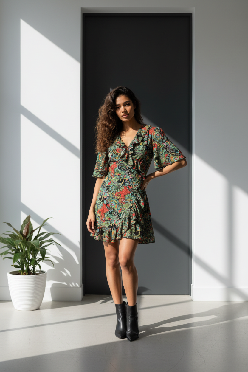 •  This enchanting short dress features a flattering wrap-around silhouette that accentuates your figure and a delicate ruffle detail all along the trim of the dress.