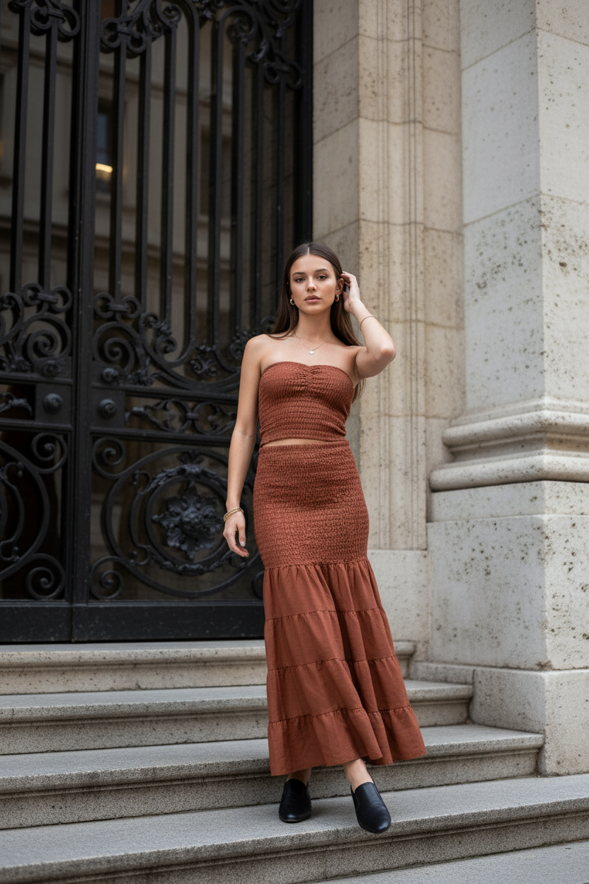 The Serena Set consists of a strapless cropped top and an elastic fitted ruffled skirt, designed for a stylish and comfortable look.